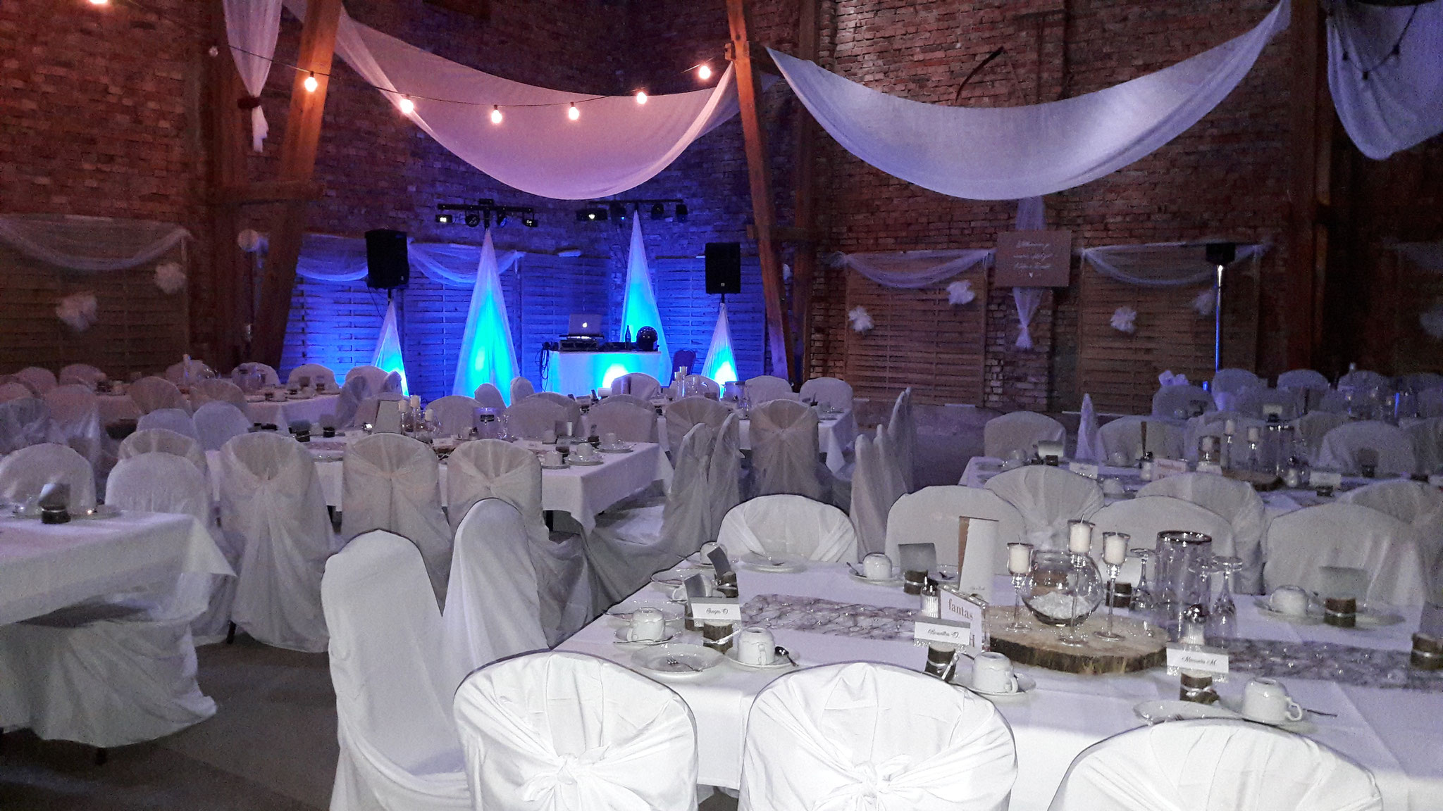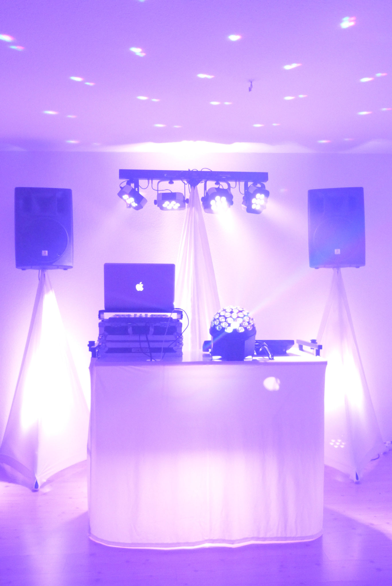 Speziell für Hochzeitsfeste werden unsere Aufbauten (DJ-Pult, Lichtstative, Boxenstative - siehe Bild) mit weißen Stoffen verkleidet und je nach Wunsch mit einer von Ihnen gewählten Lichtfarbe beleuchtet. So läßt sich unser Set in jedes festliche Ambiente stimmungsvoll einbinden.