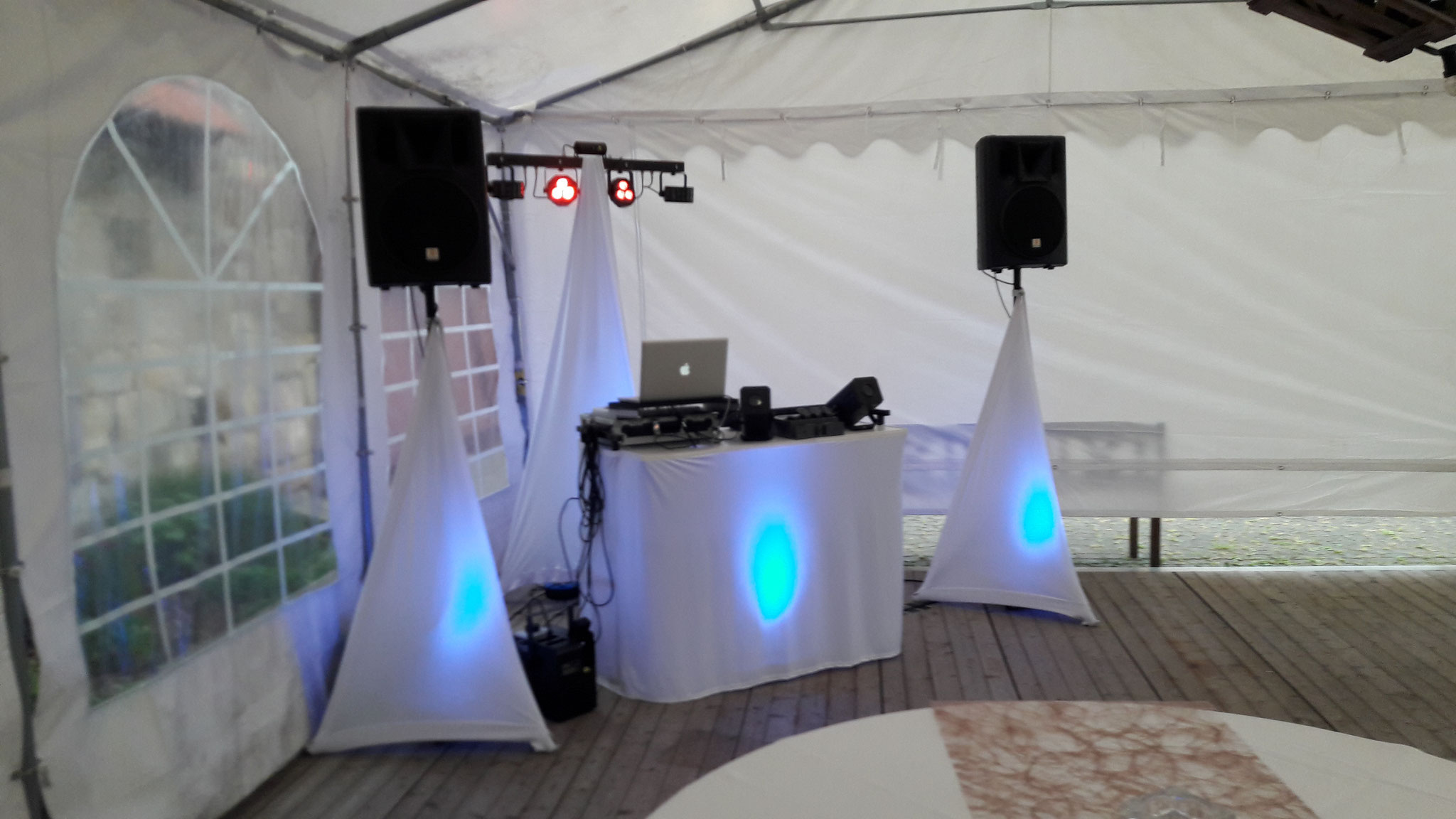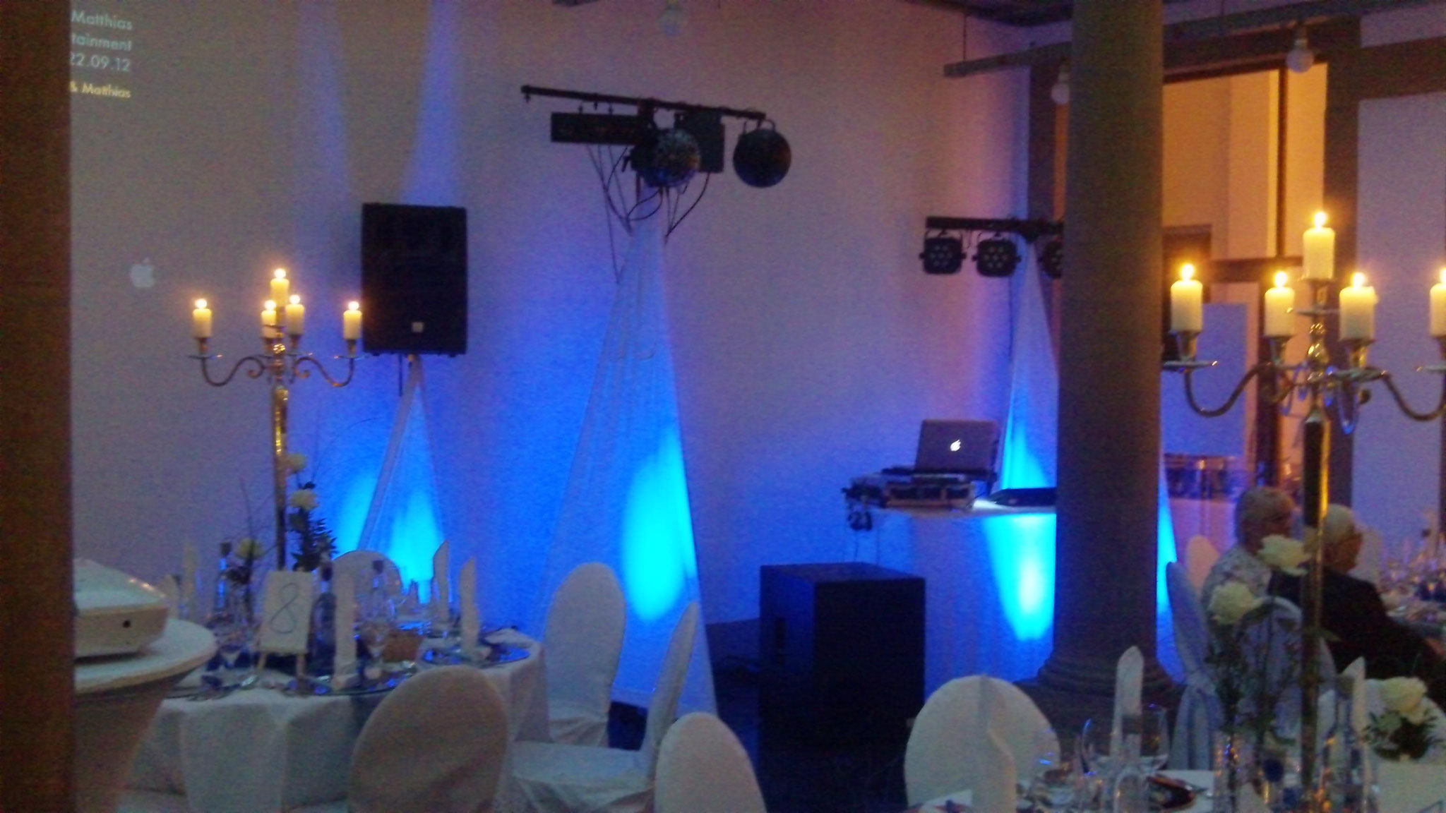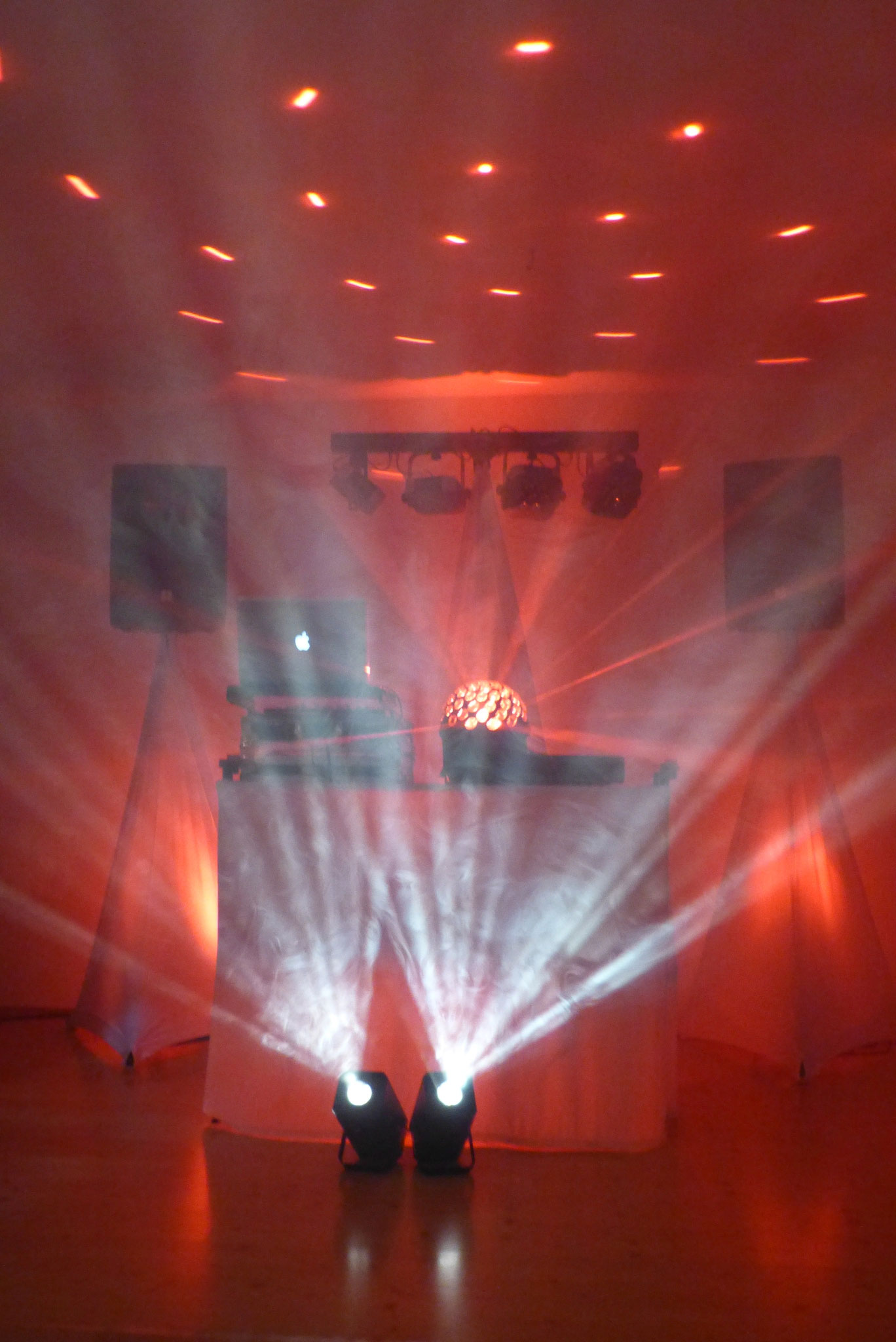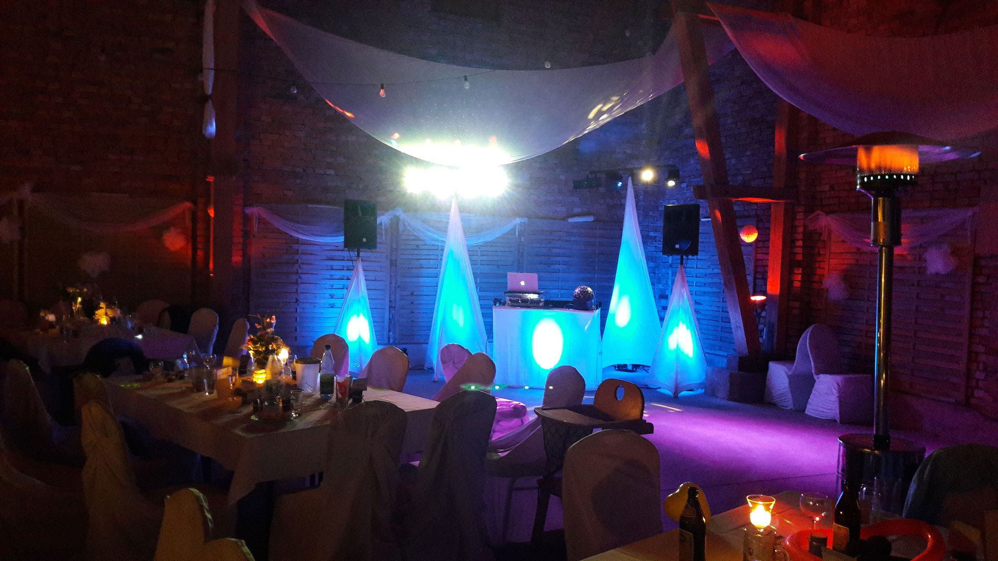 Speziell für Hochzeitsfeste werden unsere Aufbauten (DJ-Pult, Lichtstative, Boxenstative - siehe Bild) mit weißen Stoffen verkleidet und je nach Wunsch mit einer von Ihnen gewählten Lichtfarbe beleuchtet. So läßt sich unser Set in jedes festliche Ambiente stimmungsvoll einbinden.