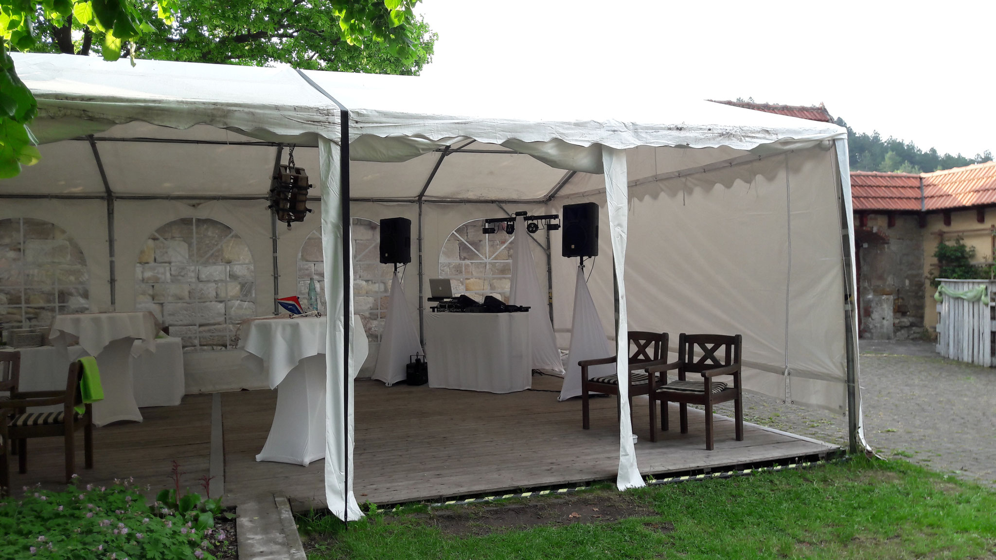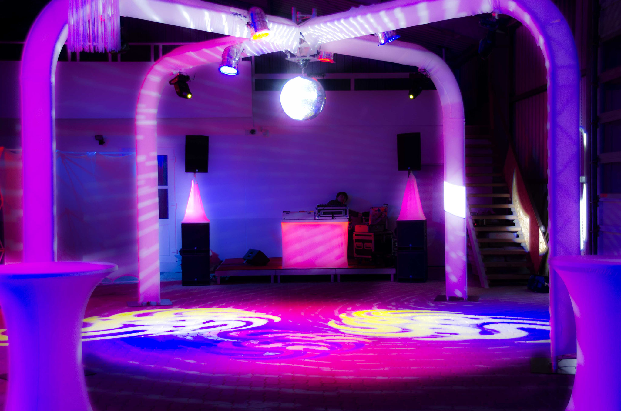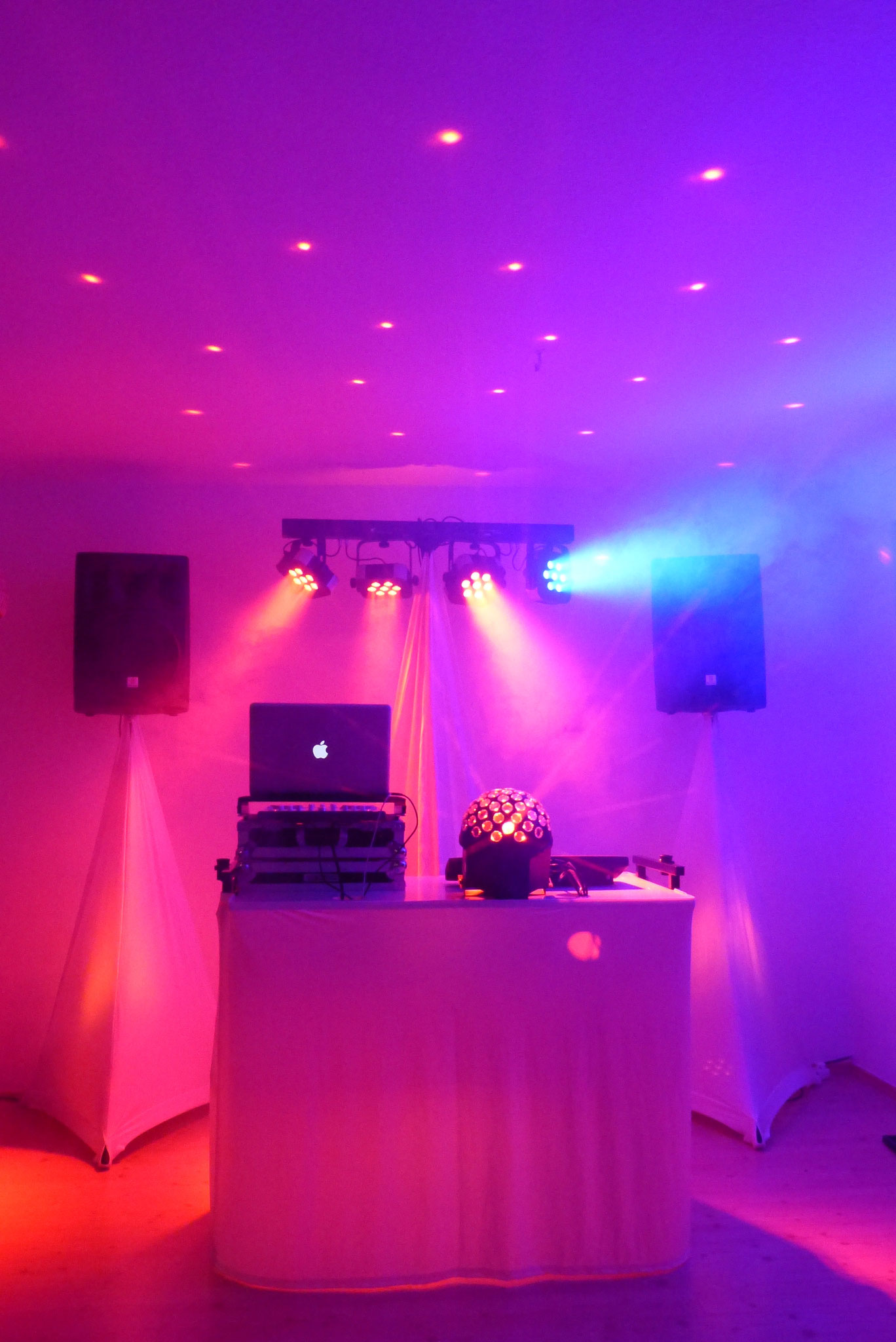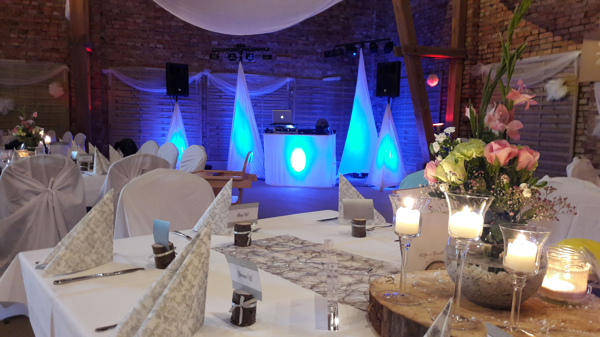 Speziell für Hochzeitsfeste werden unsere Aufbauten (DJ-Pult, Lichtstative, Boxenstative - siehe Bild) mit weißen Stoffen verkleidet und je nach Wunsch mit einer von Ihnen gewählten Lichtfarbe beleuchtet. So läßt sich unser Set in jedes festliche Ambiente stimmungsvoll einbinden.